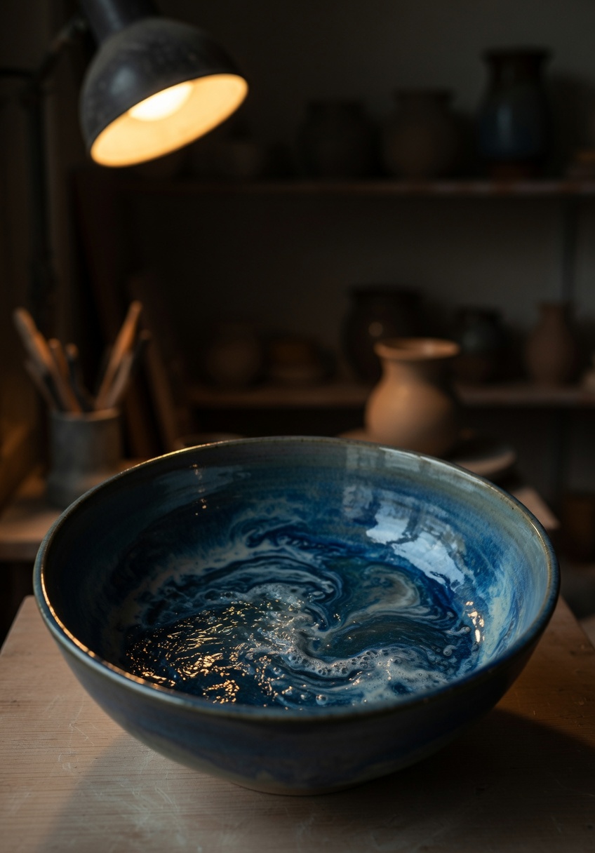 Même à cette heure-ci, le fleuve me lâche pas l'esprit. Je viens de défourner cette pièce et ce bleu-là, c'est exactement le Saint-Laurent un soir de tempête. J'ai tamisé les lumières de l'atelier pour voir comment les ombres dansent sur le grès... c'est pas pire pantoute, non ? Tranquillement, la collection pour l'expo de 2026 prend forme. On lâche pas la patate ! 🌊✨ #Ceramique #Charlevoix #Artisanat #FleuveSaintLaurent